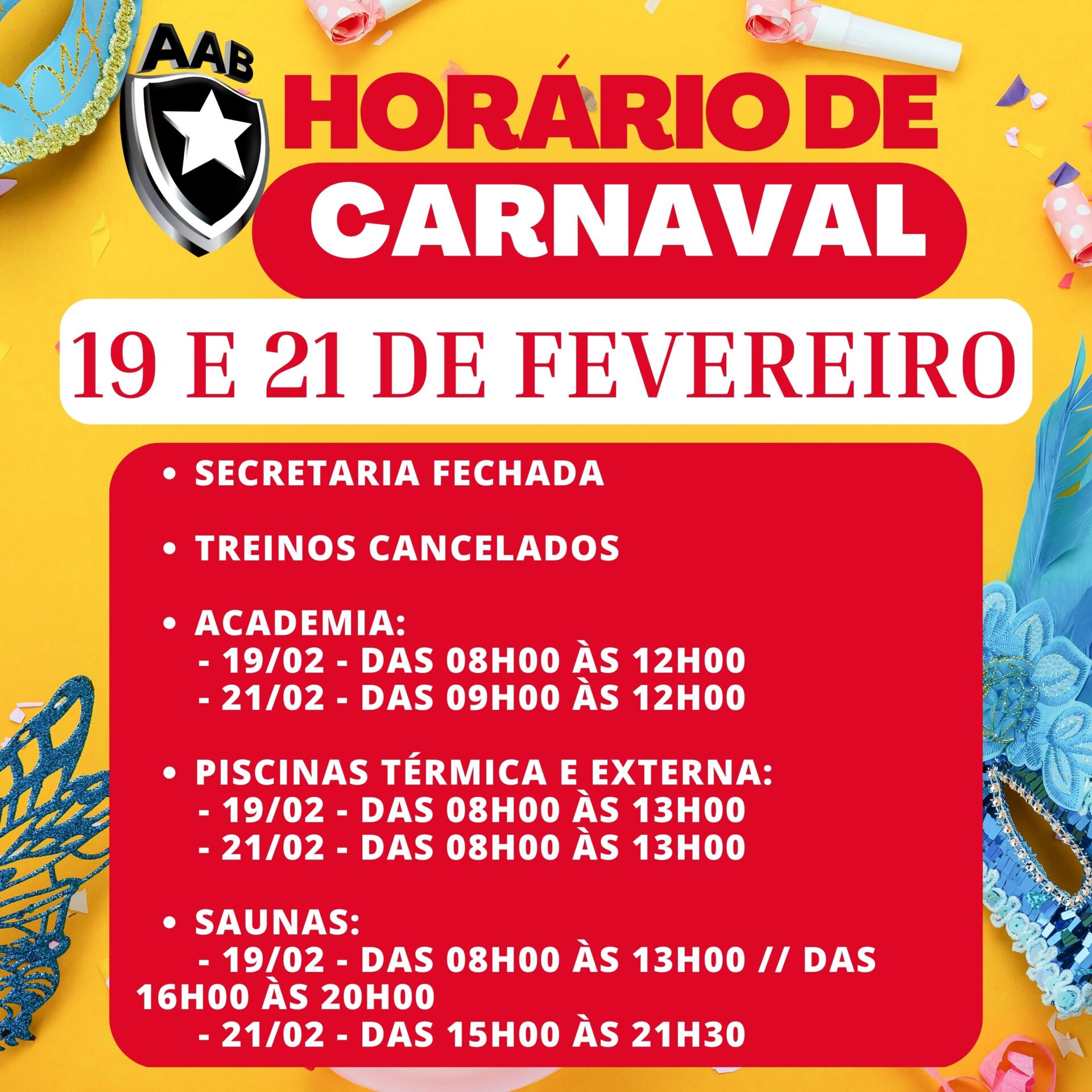 Confira os horários de funcionamento dos setores da AAB no Carnaval 2023